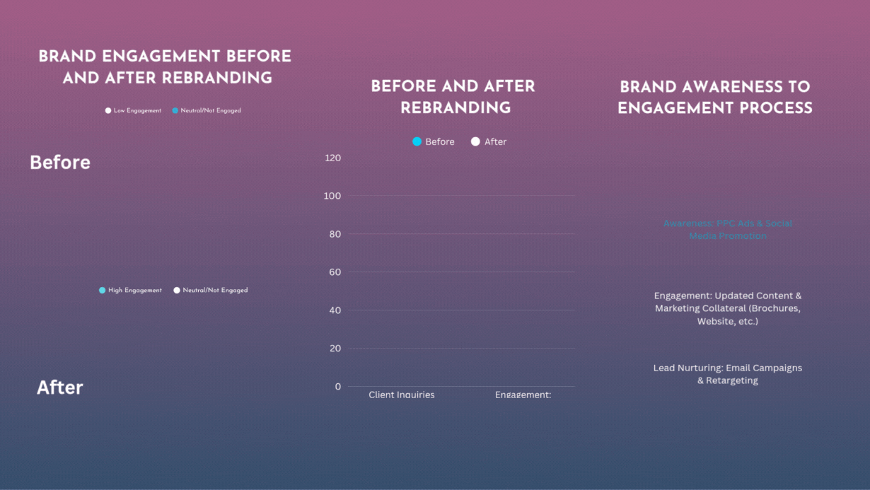 The rebranding process involved several key steps to ensure a cohesive and impactful result:Logo RedesignWe crafted a fresh, modern logo that reflects the brand’s values while positioning it as both professional and approachable. The new logo was designed with scalability in mind, ensuring it worked seamlessly across digital and print media.Website RedesignThe website was overhauled to improve user experience, with a clean, intuitive design that featured clear calls to action. We optimized the site for mobile devices and streamlined navigation, making it easier for visitors to find the information they needed. The design was aligned with modern aesthetics and responsive functionality.Updated Marketing CollateralWe refreshed the brand’s marketing materials—brochures, business cards, presentations, and email templates—to ensure consistency across all touchpoints. The collateral reflected the updated brand identity and maintained a professional, visually appealing look that aligned with the firm's values.Refined Messaging & ToneMessaging was updated to be more client-focused, conveying value, expertise, and trust. The tone was adjusted to speak more directly to the target audience's needs and pain points, making the communication feel more relatable and impactful.Market Research & Audience AnalysisWe conducted extensive market research and audience analysis to ensure that the brand’s new identity resonated with the right people. Understanding the target demographic and competitive landscape helped guide the design choices and messaging strategies.ResultsThe rebranding campaign achieved significant success across multiple dimensions:20% Increase in Client InquiriesThe new brand identity made a noticeable impact on client engagement. With the updated website, logo, and messaging, the firm attracted more qualified leads, leading to a 20% increase in client inquiries within the first few months of launch.Enhanced Brand PerceptionThe professional yet relatable new image helped to position the brand as an industry leader. The refreshed look and feel resonated with potential clients, elevating perceptions of trustworthiness, expertise, and innovation.Boosted EngagementThe updated marketing collateral and cohesive brand presence led to an increase in overall engagement. Prospective clients interacted more with the firm’s content, including increased time spent on the website and higher open rates for email campaigns.Market PositioningThe comprehensive overhaul helped the brand stand out in a crowded marketplace. By aligning the visual and messaging elements with the firm's values, the brand was able to capture the attention of new clients and build stronger relationships with existing ones.